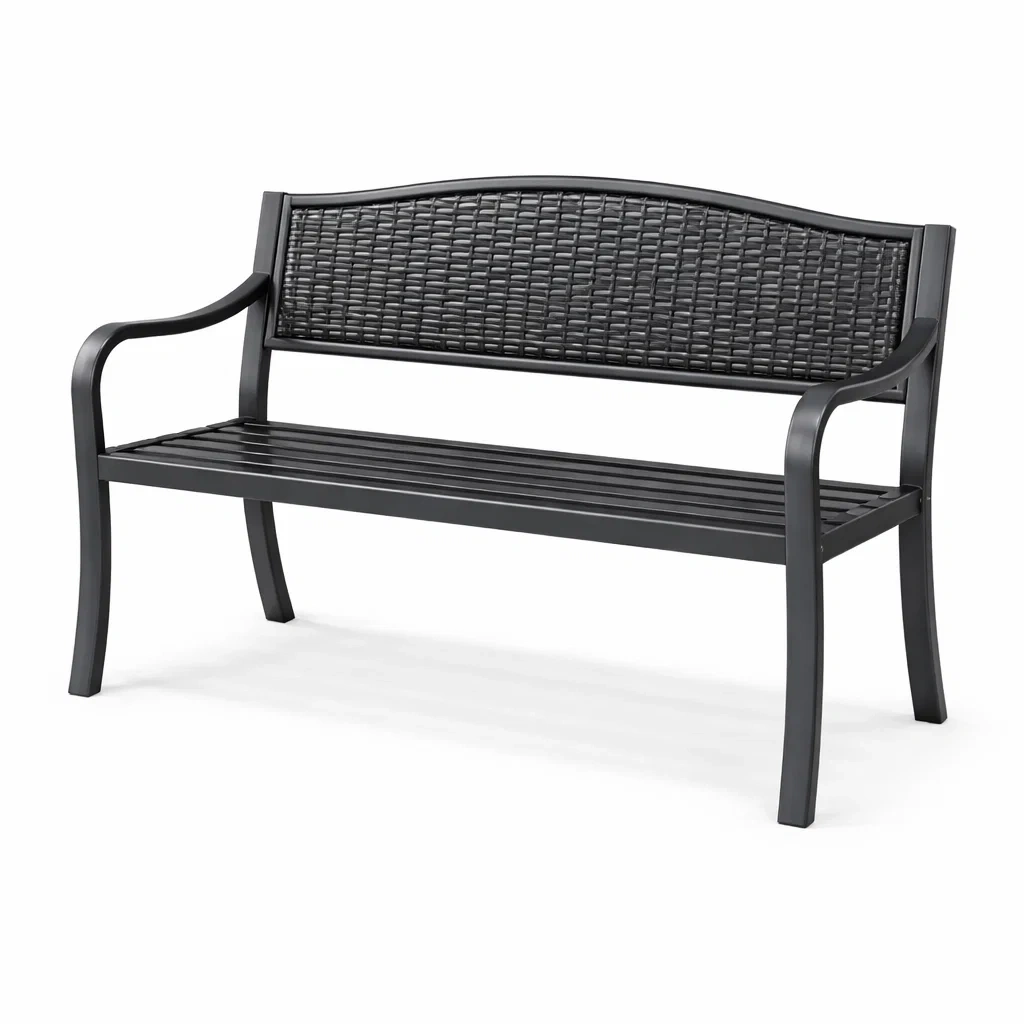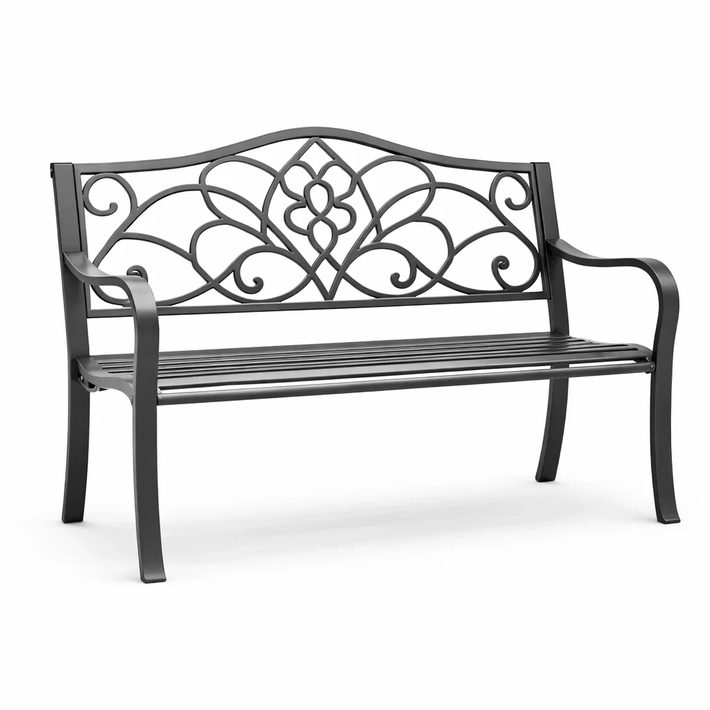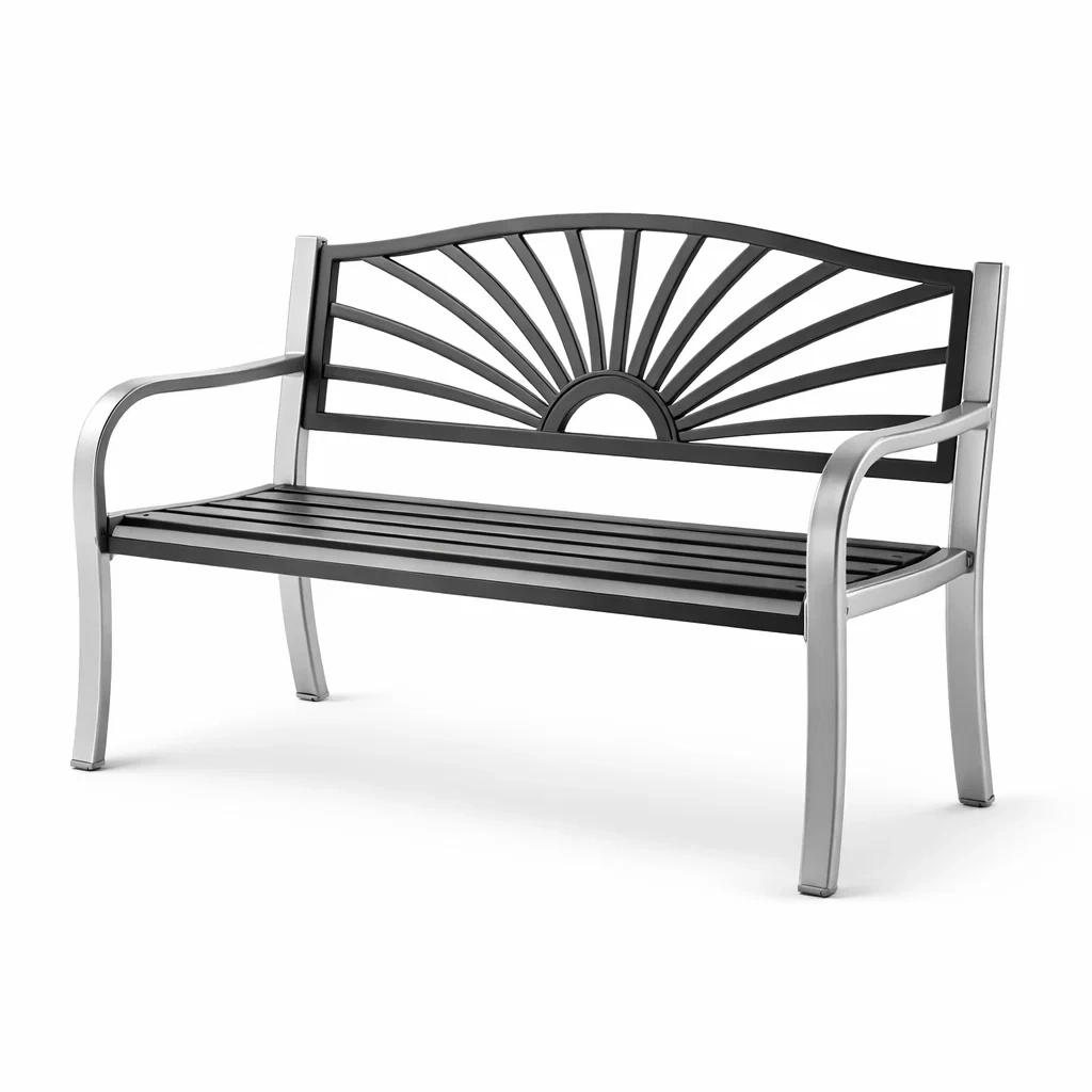 Banc de jardin en métal noir et argent avec dossier à motif soleil