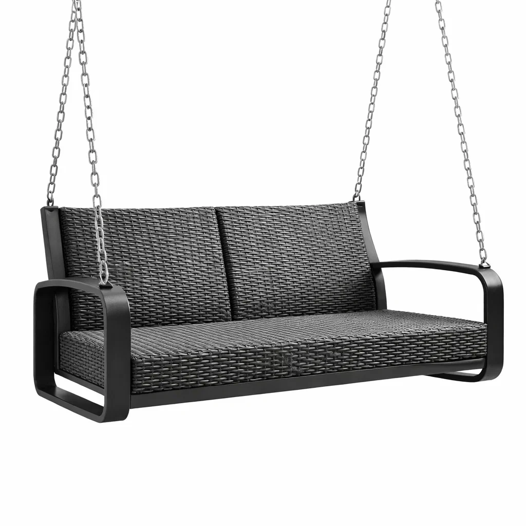 La balancelle est fabriquée en résine tressée avec une armature en acier, offrant résistance et durabilité pour l'extérieur.