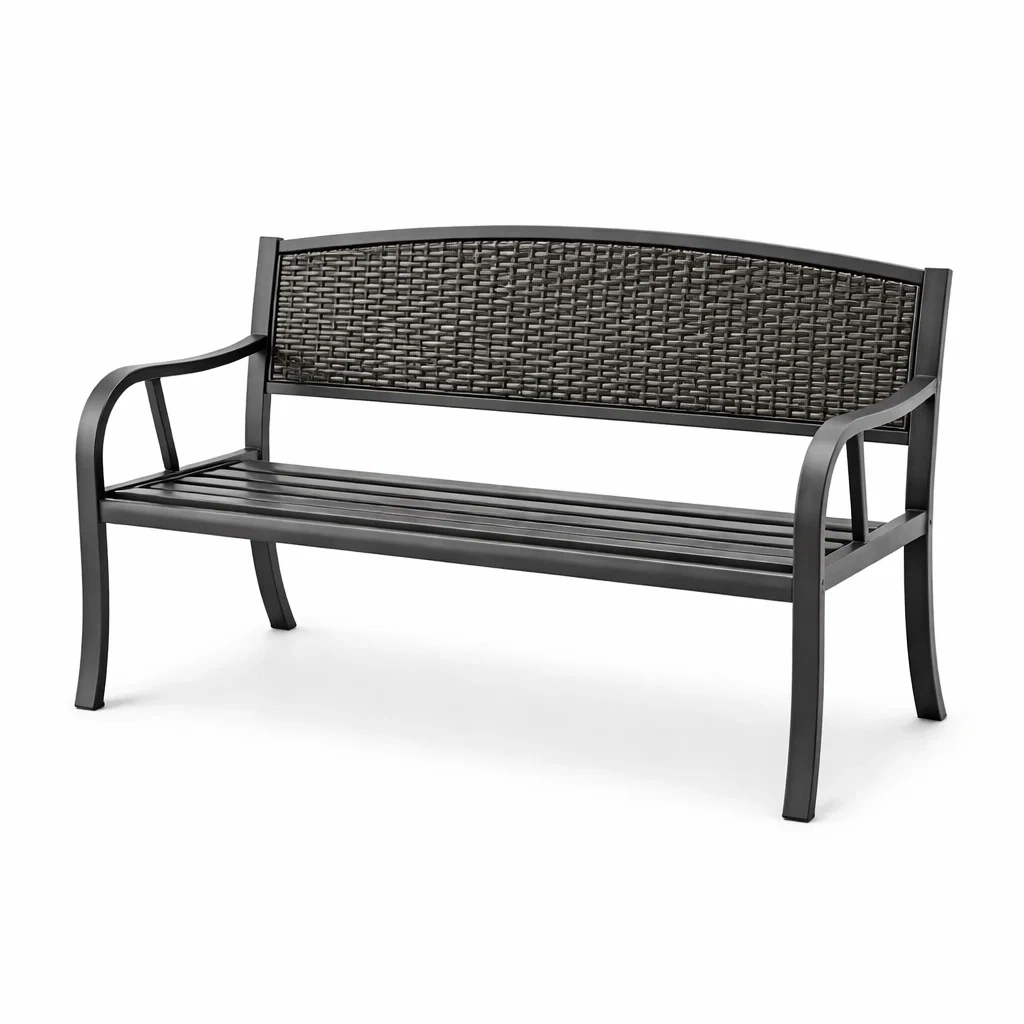 Ce banc est fabriqué avec une structure en acier et un dossier en rotin synthétique.