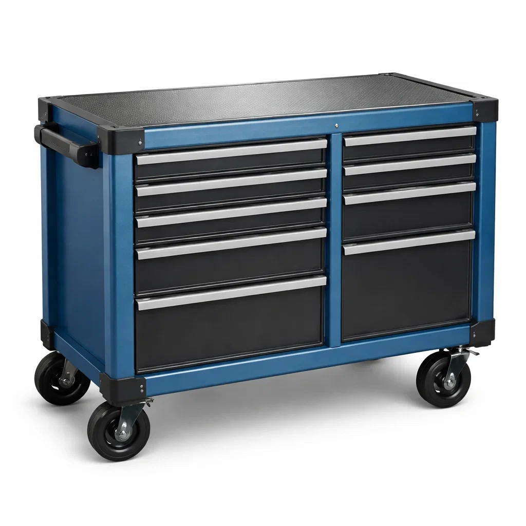 Le chariot à outils est conçu en acier robuste avec une finition anti-rayures. Il est doté de 9 tiroirs spacieux pour le rangement des outils. Les tiroirs sont faits d'acier avec une finition qui résiste aux rayures. Le chariot est monté sur des roues en caoutchouc permettant une mobilité facile. Les poignées sont en plastique durable.