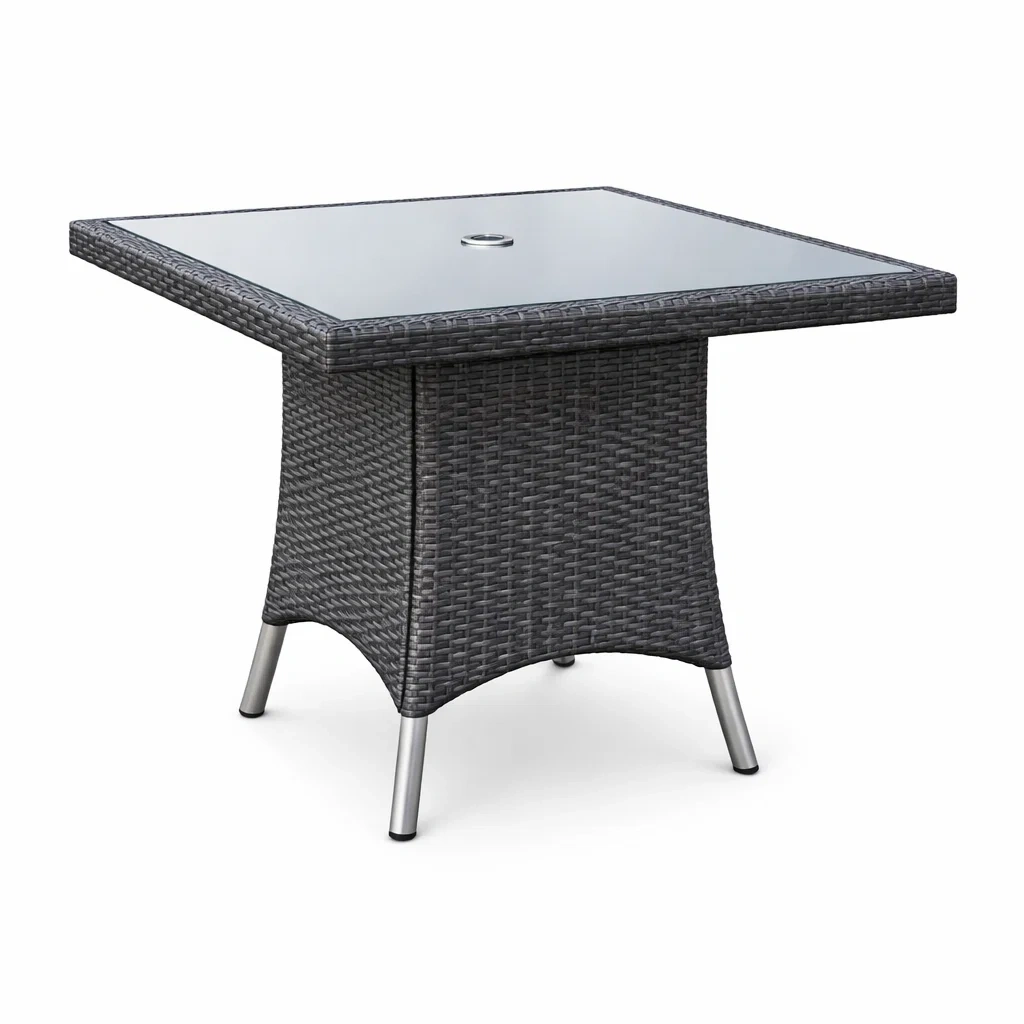 Cette table de jardin carrée est conçue en rotin synthétique gris et dispose d'un plateau en verre trempé de 5 mm d'épaisseur. Ses dimensions sont de 90 cm de longueur, 90 cm de largeur et 72 cm de hauteur. Elle pèse 15,5 kg et est adaptée pour une utilisation en extérieur. Nettoyez-la simplement avec un chiffon humide.