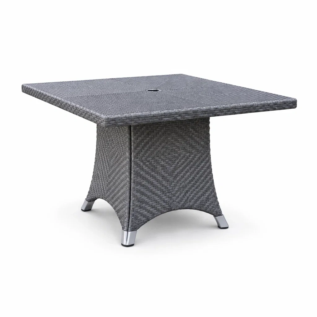 Cette table carrée est fabriquée en rotin synthétique résistant aux intempéries, parfaite pour une utilisation en extérieur. Ses dimensions sont de 90 cm de longueur, 90 cm de largeur et 75 cm de hauteur. Le cadre est en aluminium et la table a un trou au centre pour un parasol. Elle peut supporter jusqu'à 50 kg. Nettoyage facile avec un chiffon humide.