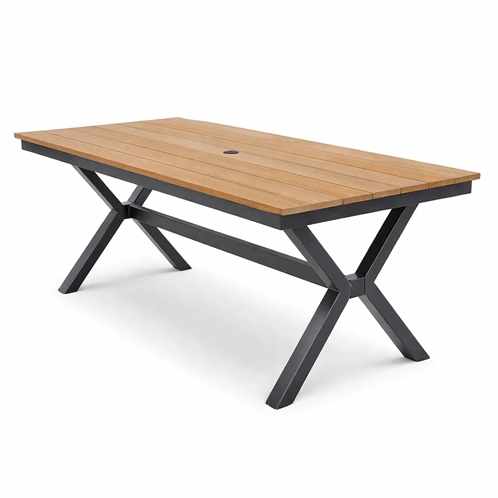 Matériau principal : Plateau en bois de teck, pieds en aluminium peint.