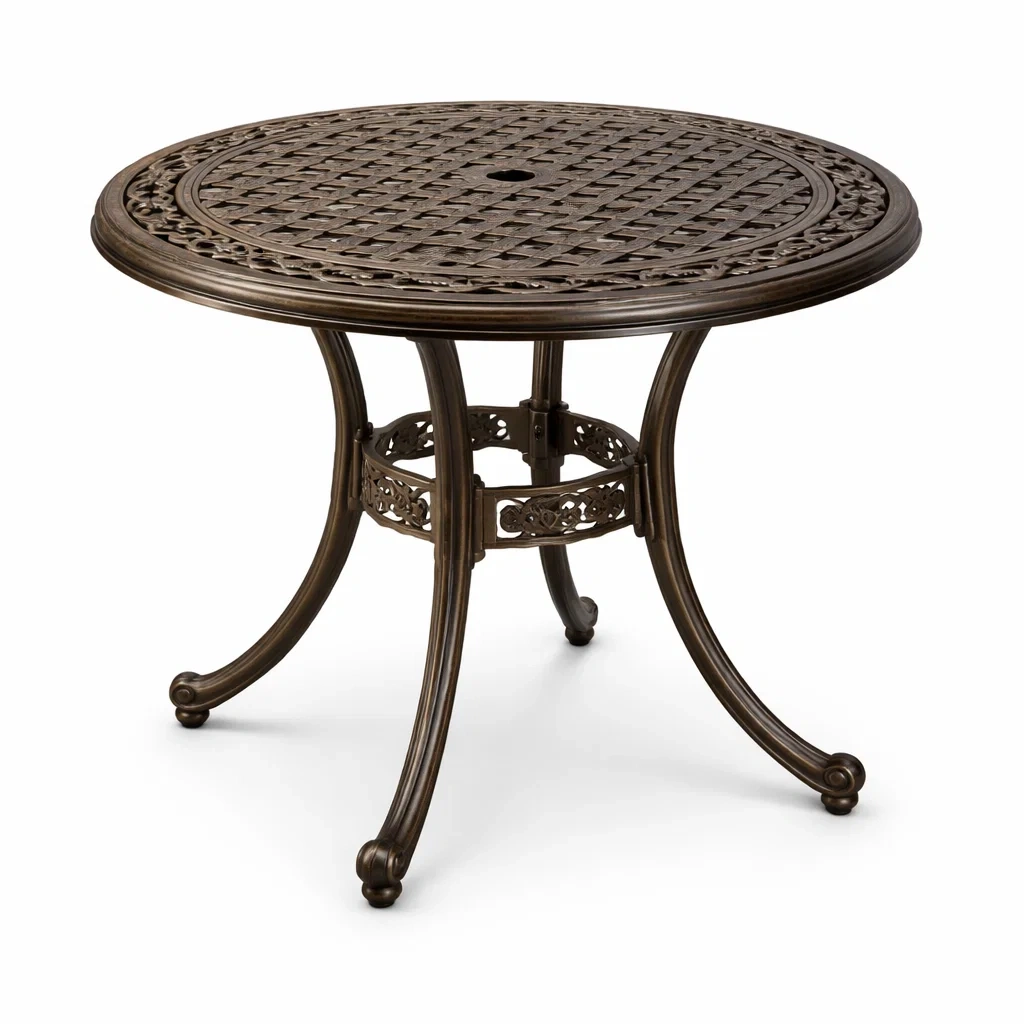 Table de jardin en aluminium avec finition résistante aux intempéries.